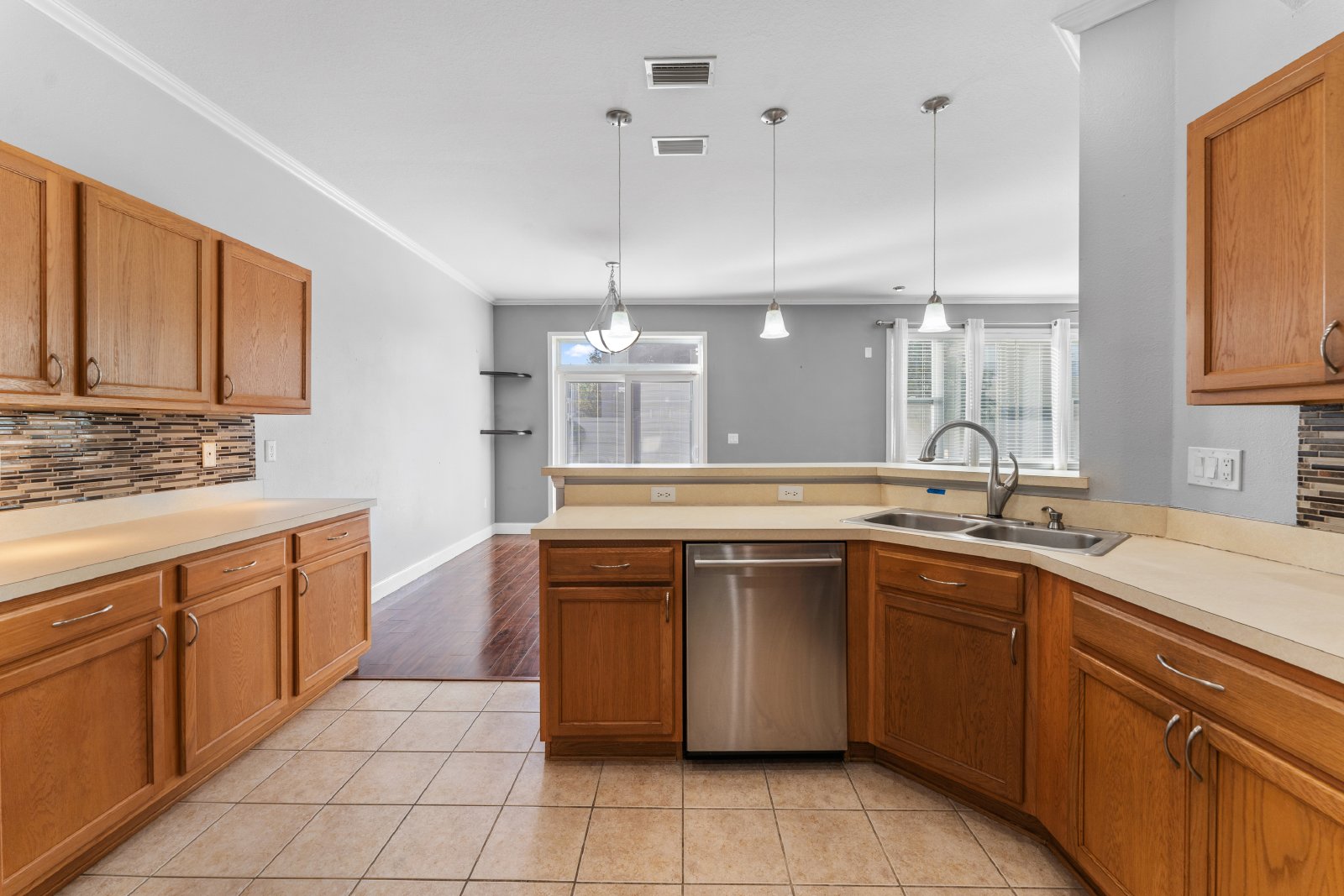 The kitchen is a chef's delight, featuring can lights, upper and lower cabinet lighting, and pendant lights over the breakfast bar, all accentuating the luxurious glass tile backsplash. The gorgeous, thick, high-grade laminate wood floors sprawl seamlessly across the first floor and second-floor common areas, including the master bedroom in this rental home.